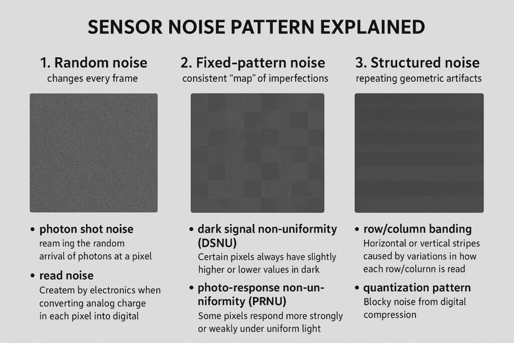 - Photo-response non-uniformity (PRNU) – Zelfs bij gelijkmatig licht reageren sommige pixels sterker of zwakker, waardoor een vaag dambord- of strepenpatroon ontstaat.